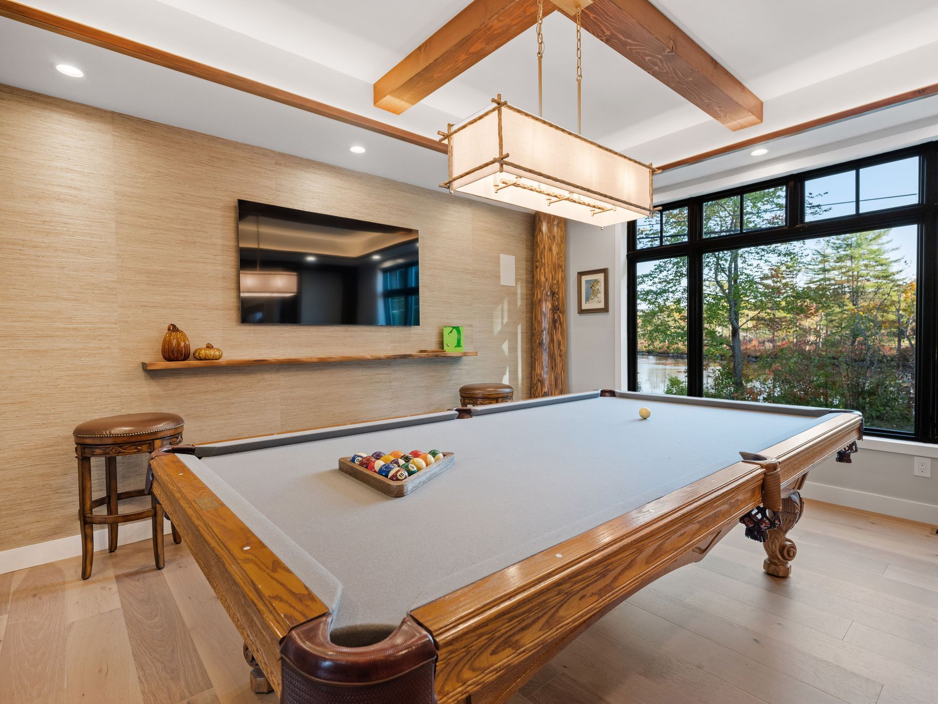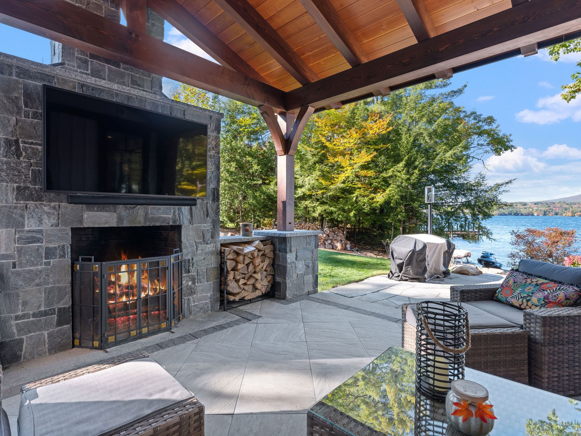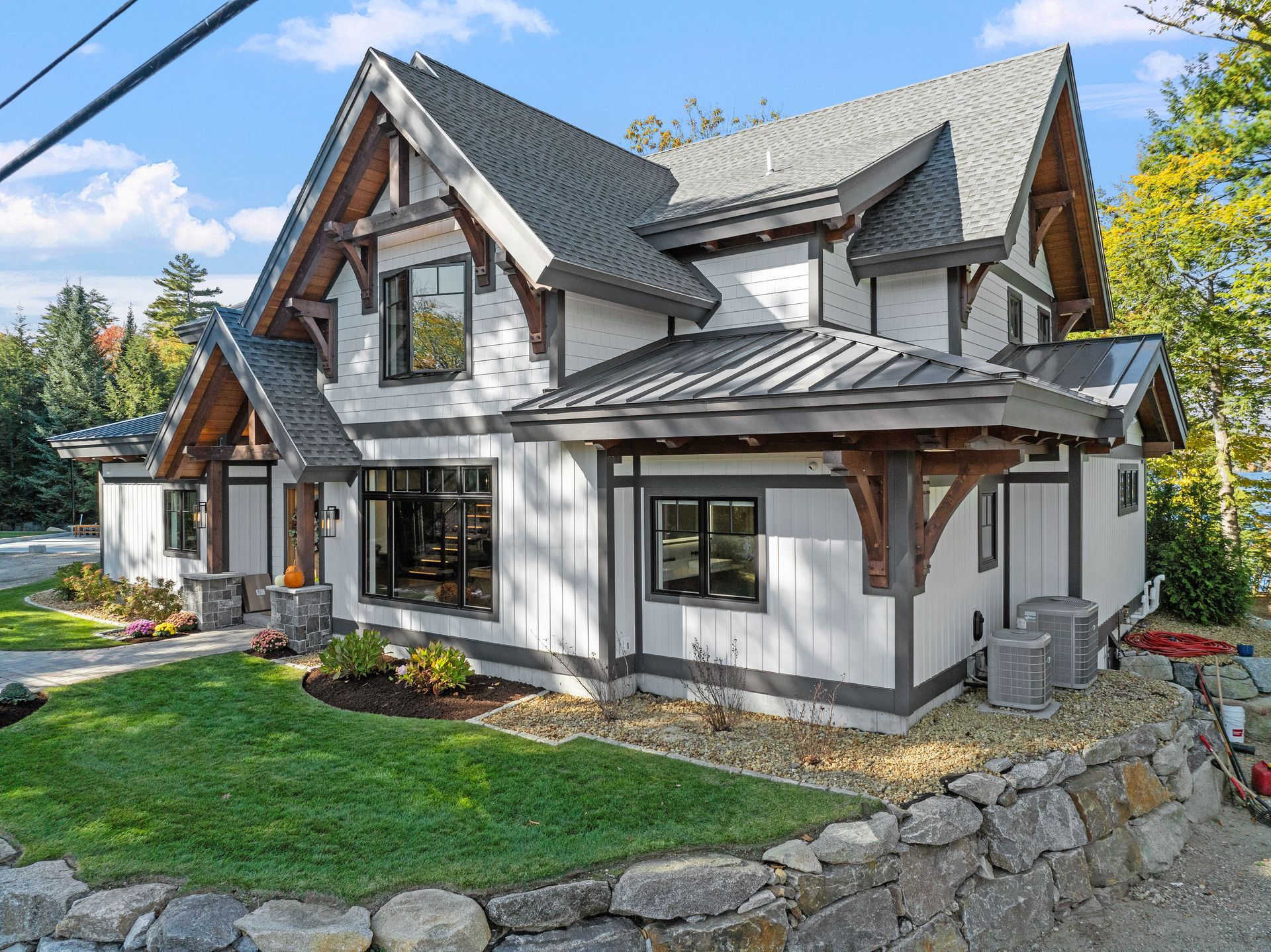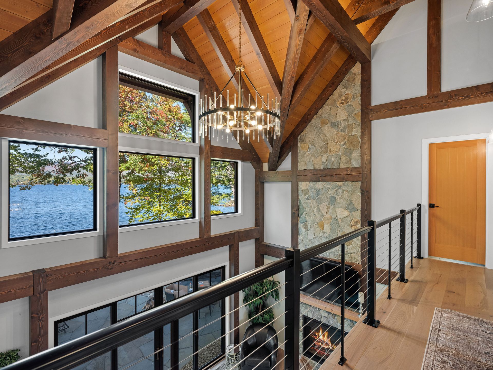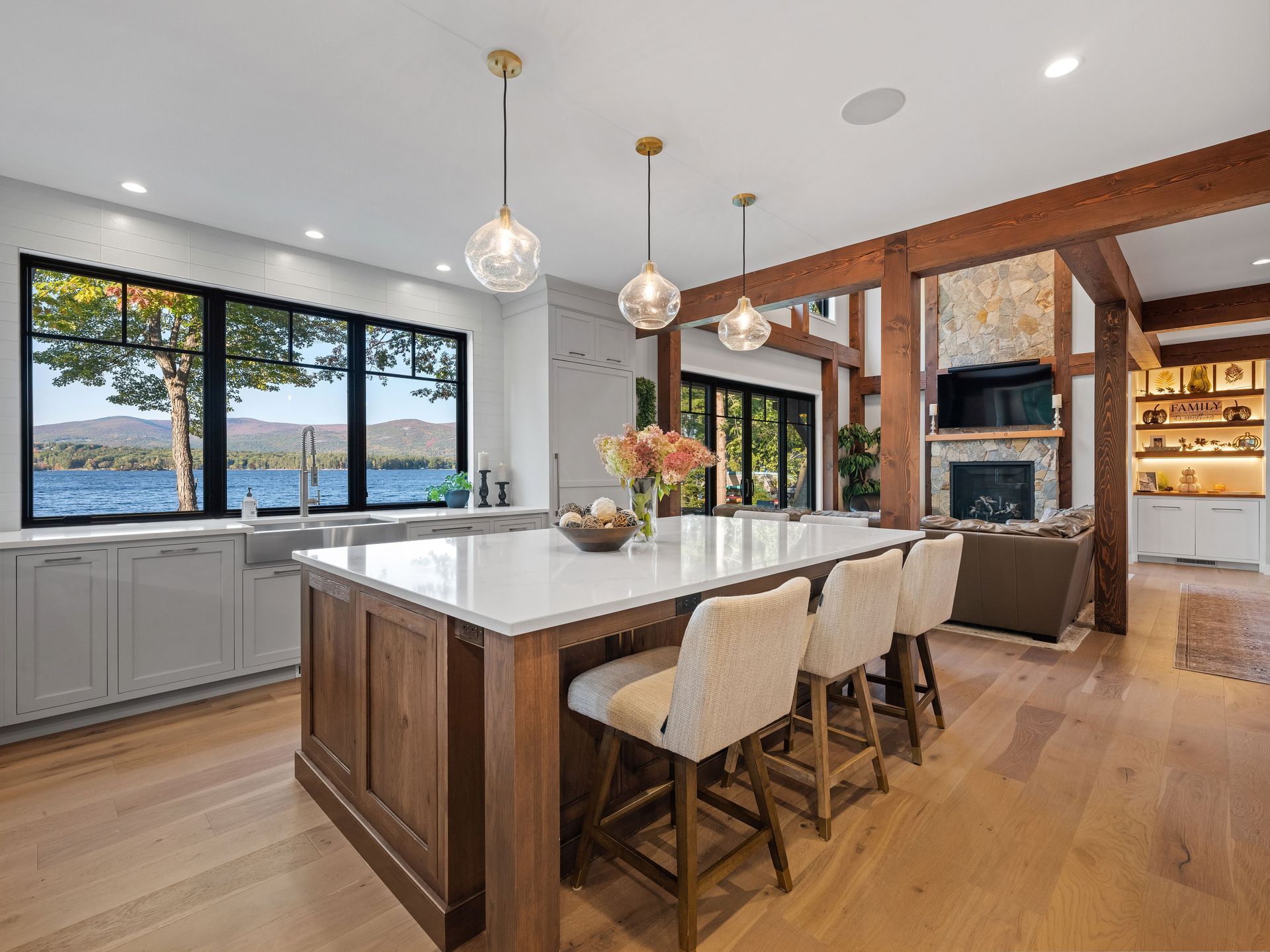This modern lake house is a pure example of custom design and construction. Rustic timbers from Canadian Timberframes are blended with a transitional style that opens to Lake Winnipesaukee on both sides of the home. Upon entering, the floating staircase and billiard room with wet bar set the stage for a fun atmosphere. Unique cabinetry, wall coverings and tile will keep you exploring this trendy, yet warm, lakefront home. The connection to the exterior environment is created by the Pella Windows & Doors and allows you to flow onto an amazing exterior covered patio with fireplace for those cool fall nights. Family and friends are at the very core of this home – right where they should be!